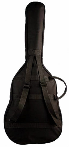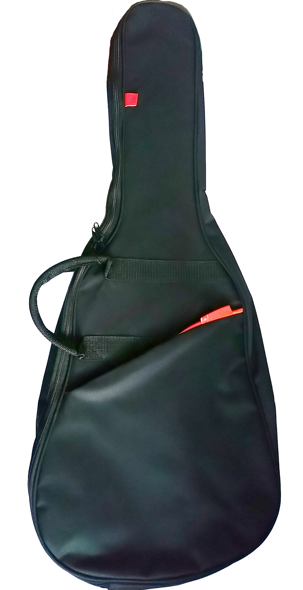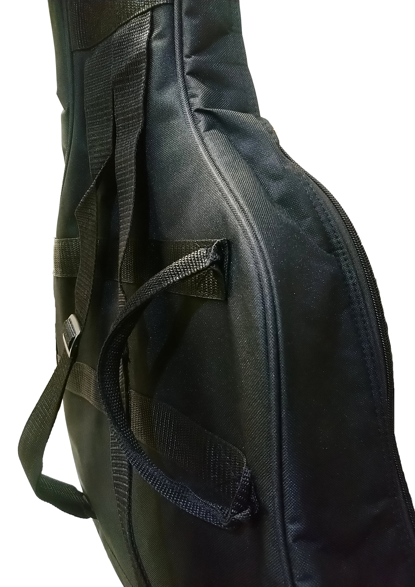 Lona negra con cremallera acolchada de 5mm para proteger la guitarra frente a los pequeños golpes. Asa para transportar a mano y bandoleras de nylon tipo mochila.
