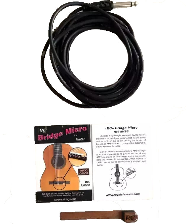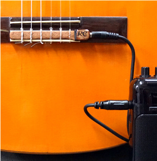 Se instala en el puente utilizando la tensión de las cuerdas. Incluye cable jack-mini desconectable para amplificador o mesa de sonido. Funciona sin pilas.