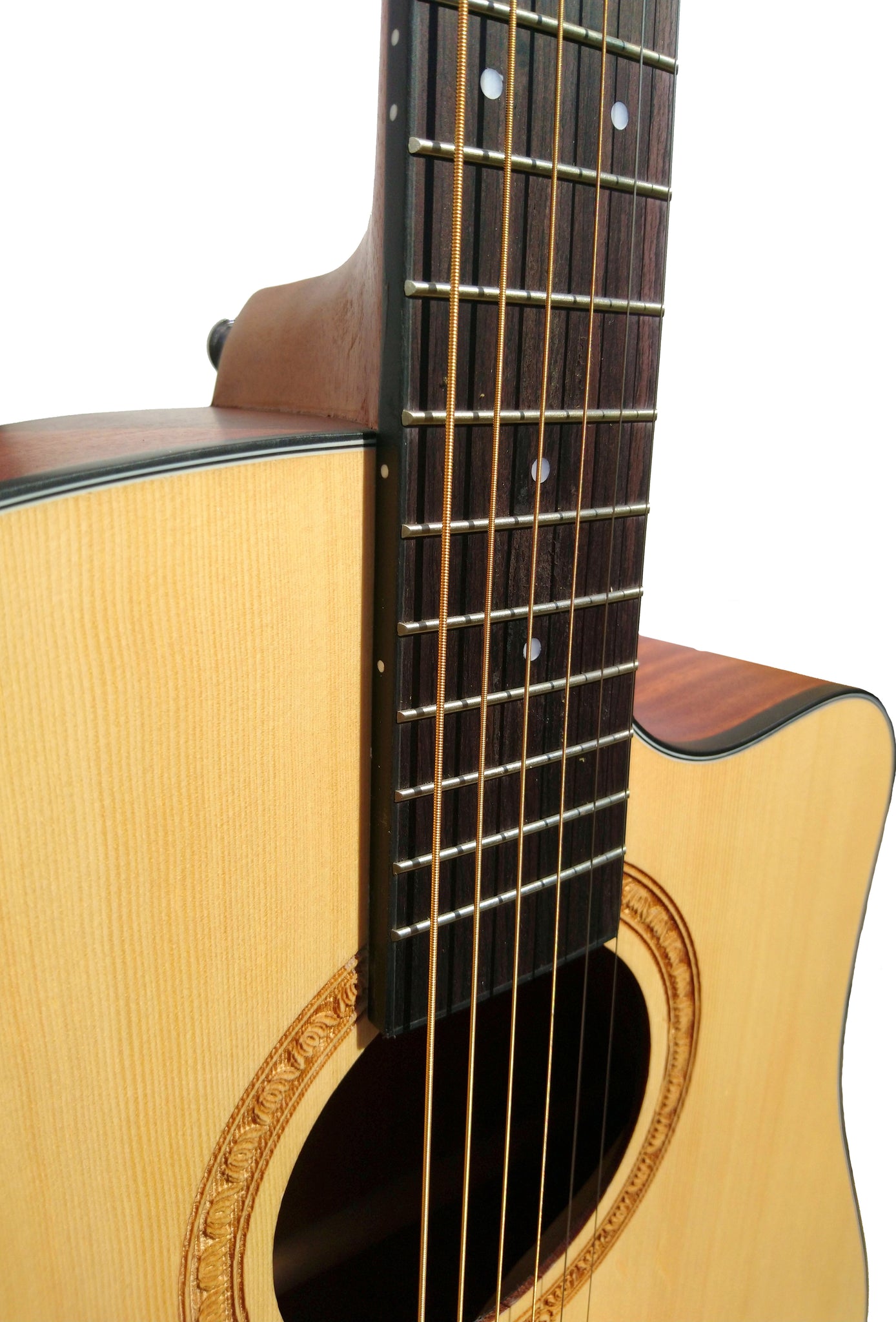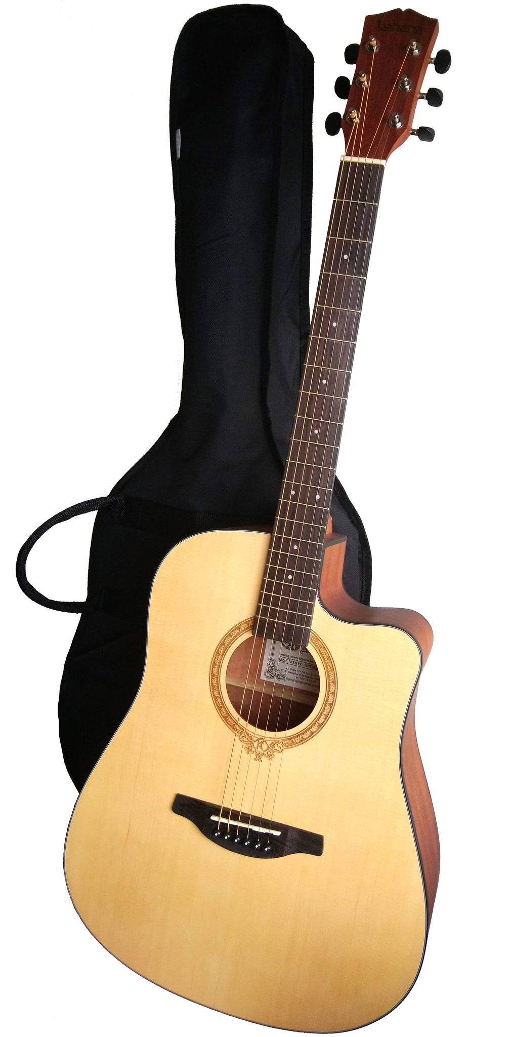 Guitarra acústica cutaway + funda (caja armónica de Caoba, diapasón y puente de Palosanto. Tapa de Pino. Mástil: Okume. Tamaño adulto).