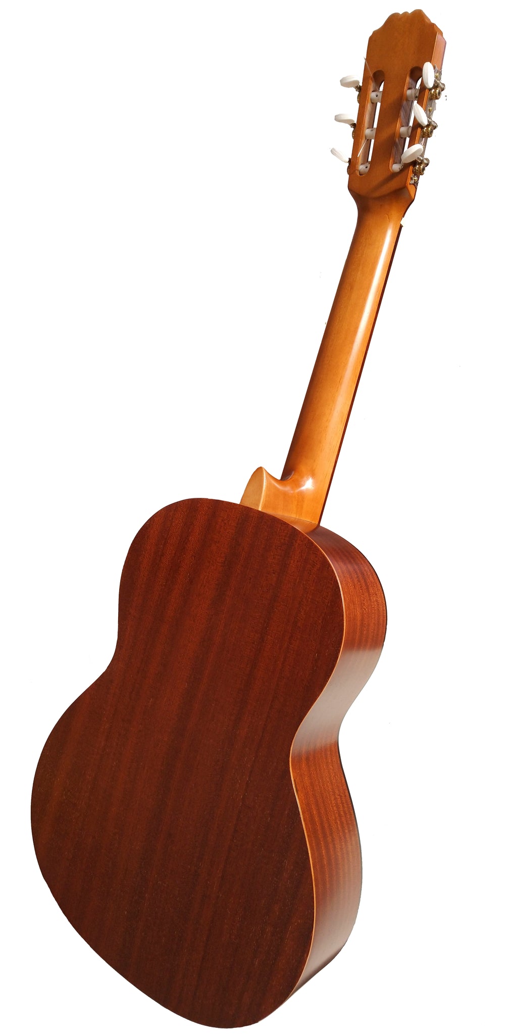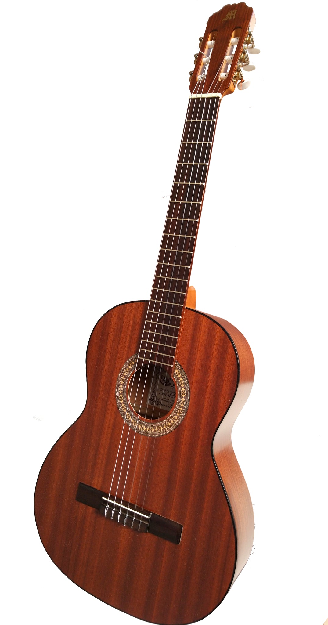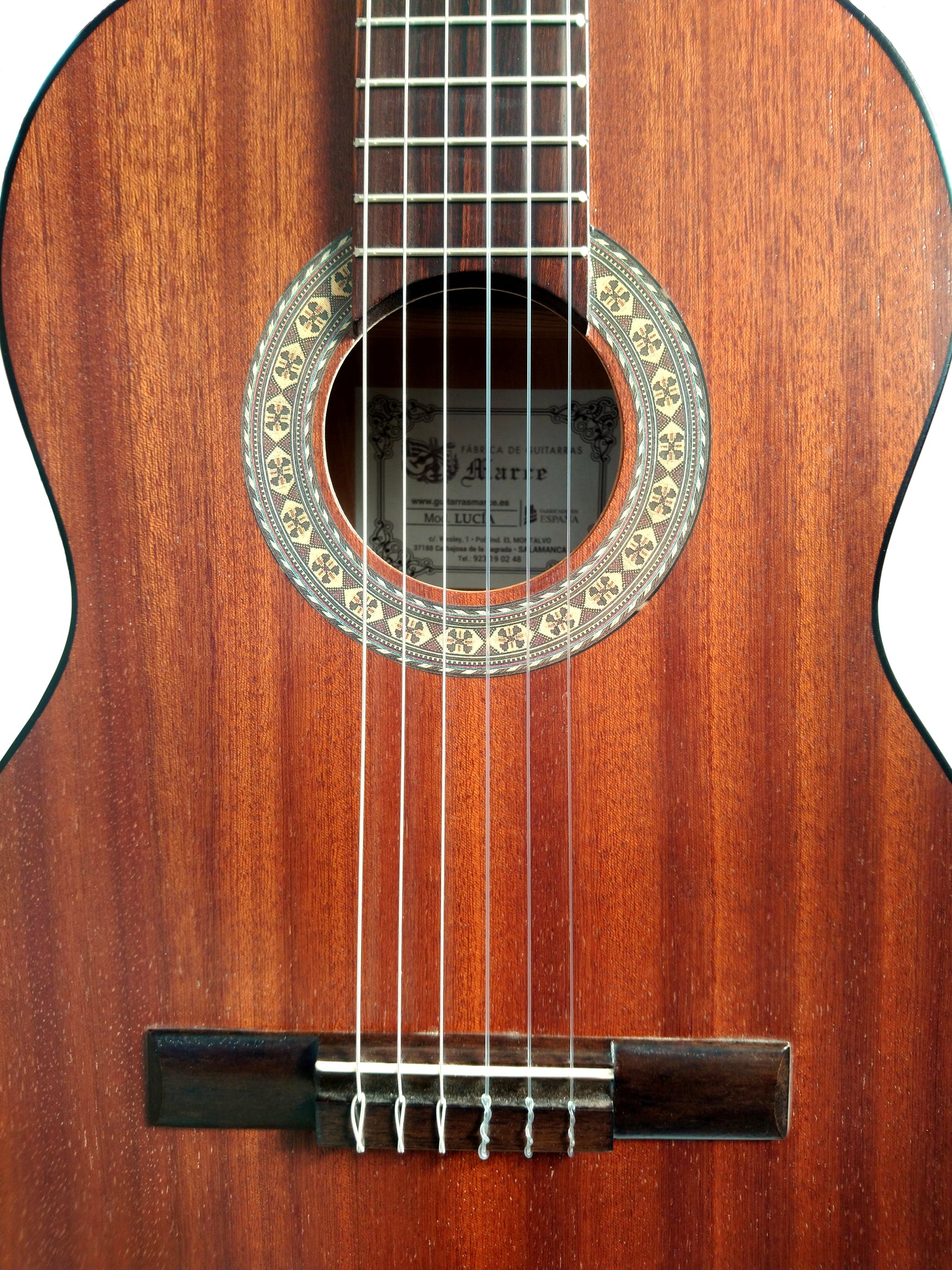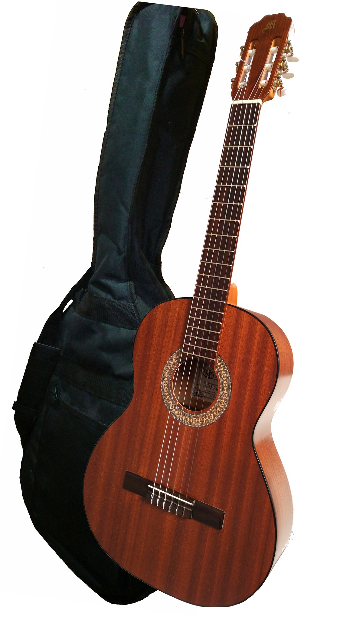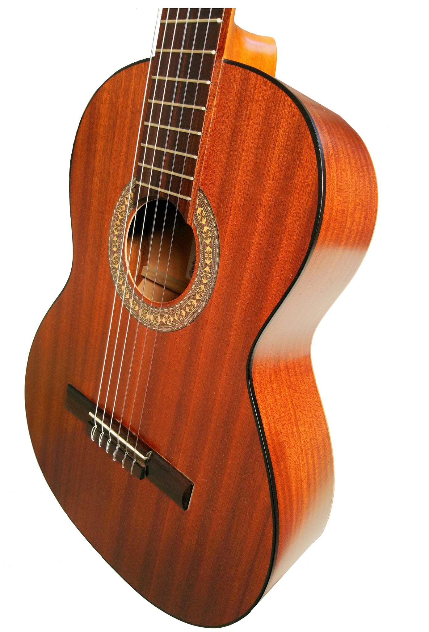 Guitarra clásica española de estudio (caja armónica de madera de Sapelly, un perfíl en negro, diapasón de de Nogal americano. Tamaño adulto).